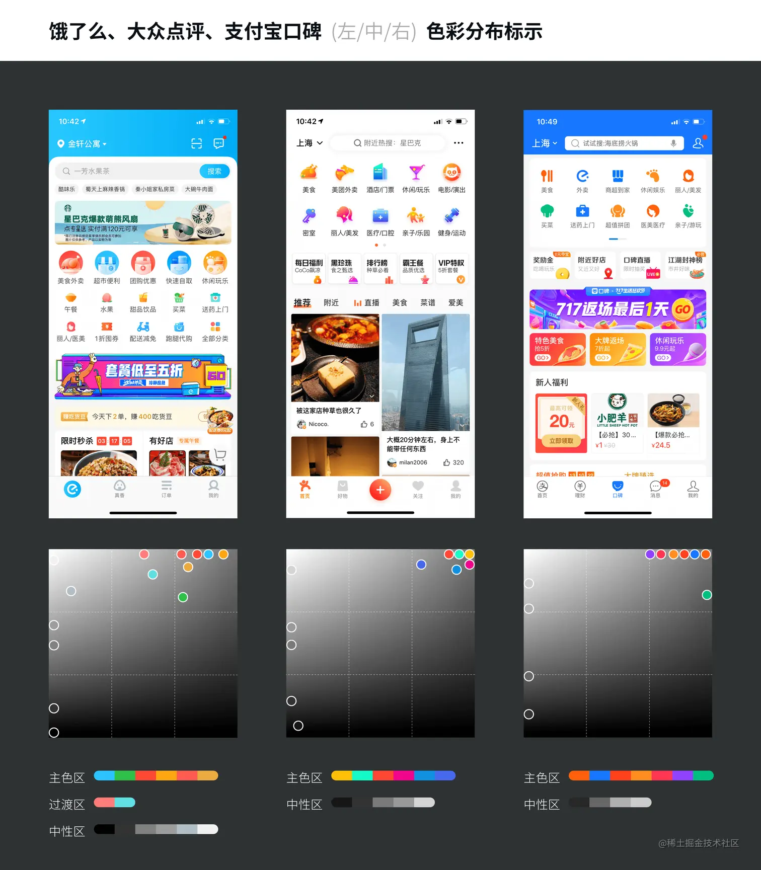 互联网产品的主色和重要辅助色都会往右上角聚集,一些次要、不可点的色彩聚集在中上方,而文字背景色则聚集在左侧,无人区则是我们重点避开的对象。