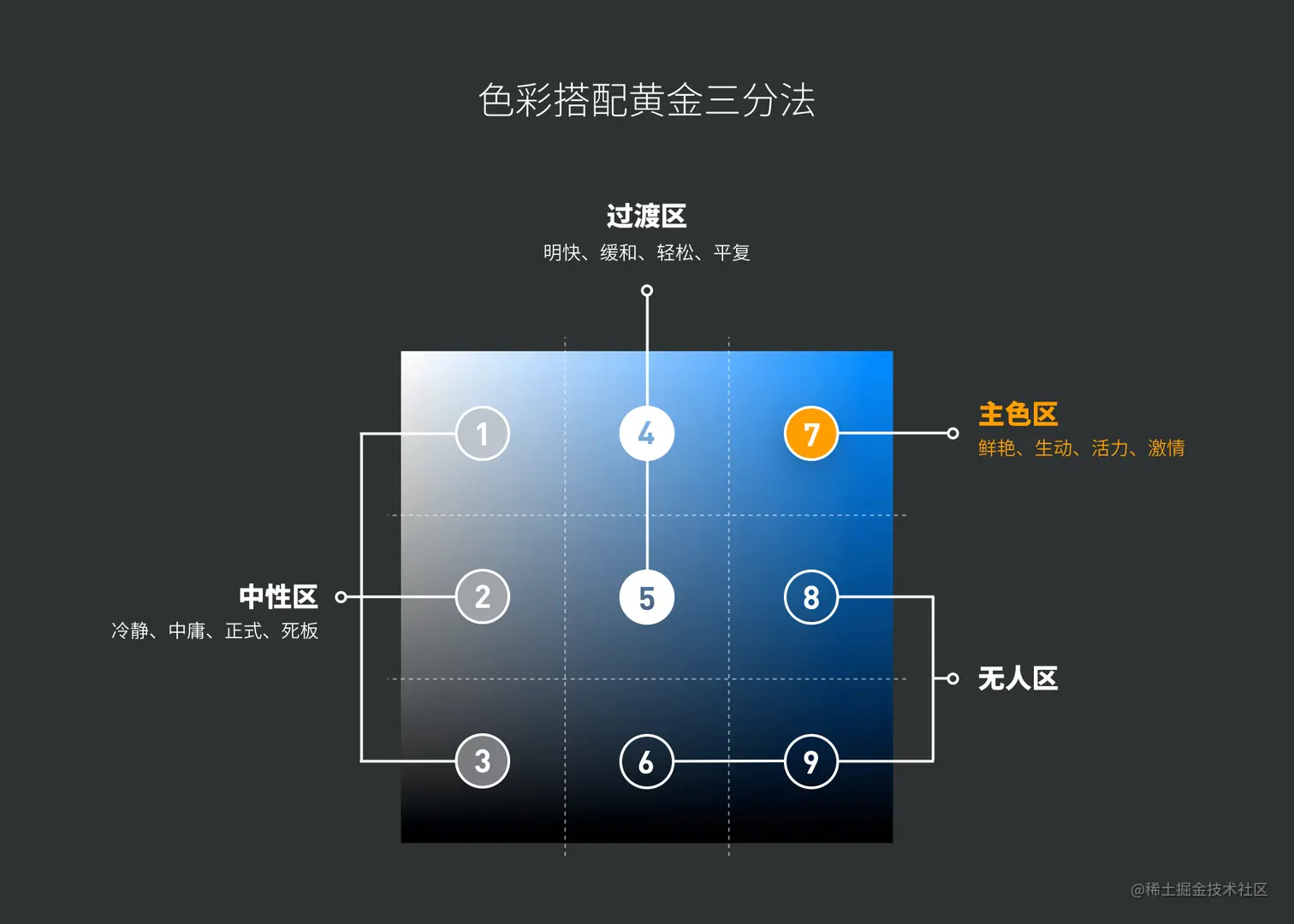 接下来就要说到重点,饱和度和明度选择区,我自己使用的习惯,是将这个选择区通过黄金三分法的方式切割成等比的 9 个区域,然后明确它们在 UI 中的对应情绪和应用场景。