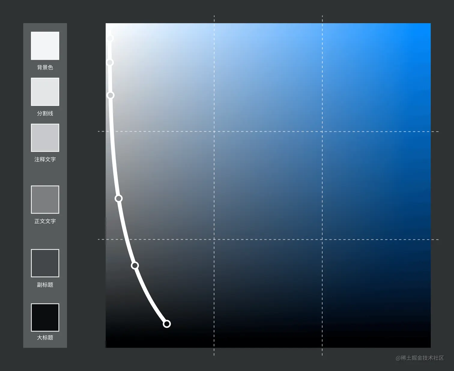 这种做法,颜色越浅的时候饱和度应用色值就越低,将这个规律在拾色器中进行表现,那么我们就可以得到一个 L 型曲线,我称它为 “中性曲线”。