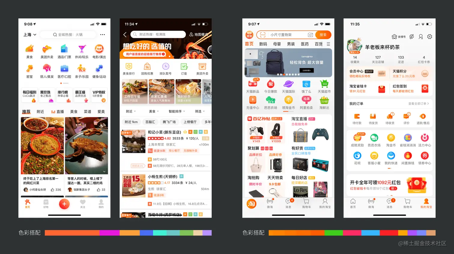 主色会作为顶部标题栏或其它重要模块中的背景色,进行大面积应用,加深用户对品牌的认知和辨识度。而产品中又包含了大量功能和服务,需要用丰富的色彩来进行暗示,吸引用户关注。