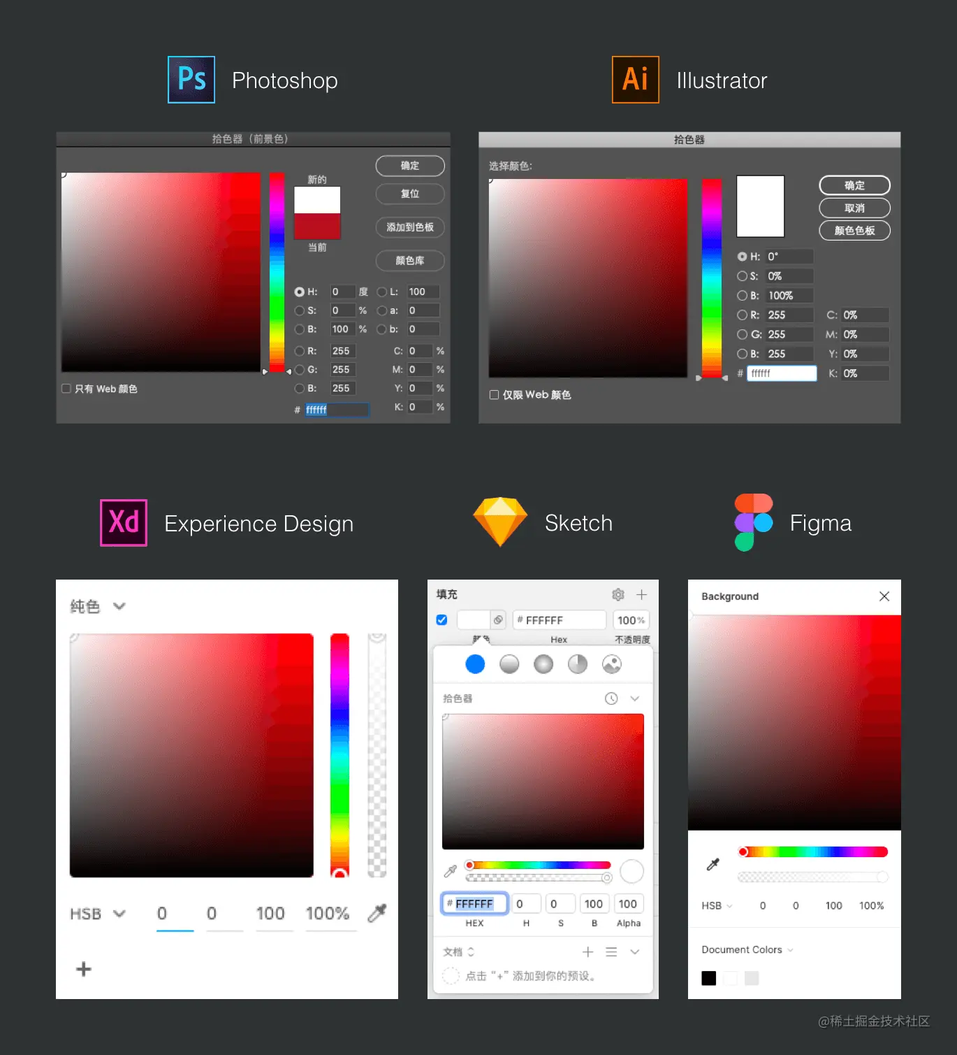 无论用 PS、AI,还是 Sketch、XD、Figma,和色彩打交道最多的地方就是拾色器窗口,我们来看看这些案例: