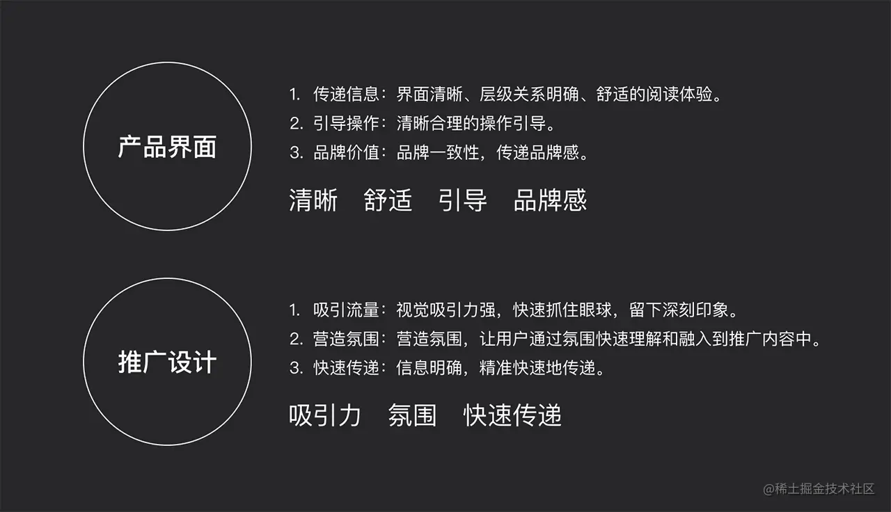 我们将这两种配色目标做一下关键词提炼,产品界面设计的配色关键词:清晰、舒适、引导、品牌感。而推广设计的配色关键词为:吸引力、氛围、快速传递。