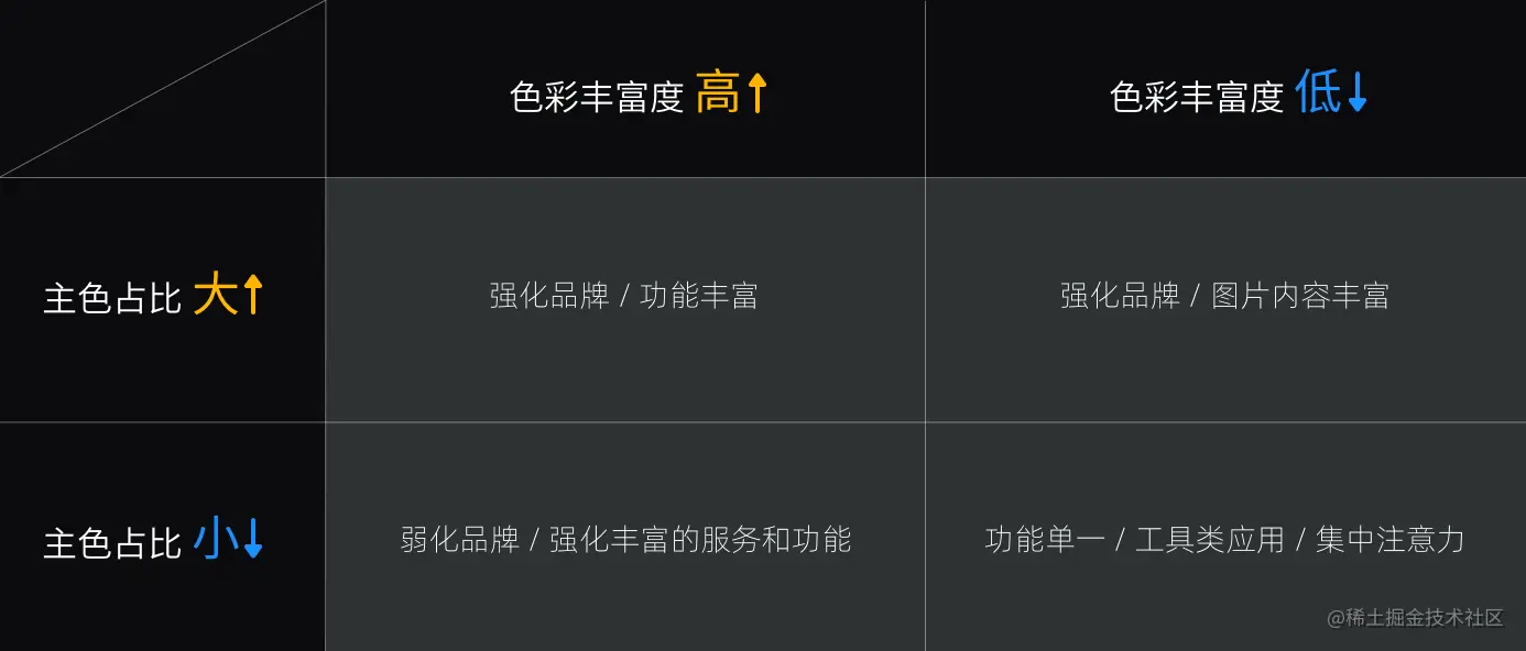 所以,我根据主色和辅助色应用总结了一个配色的四象限表格,在分别看看它们对应的案例: