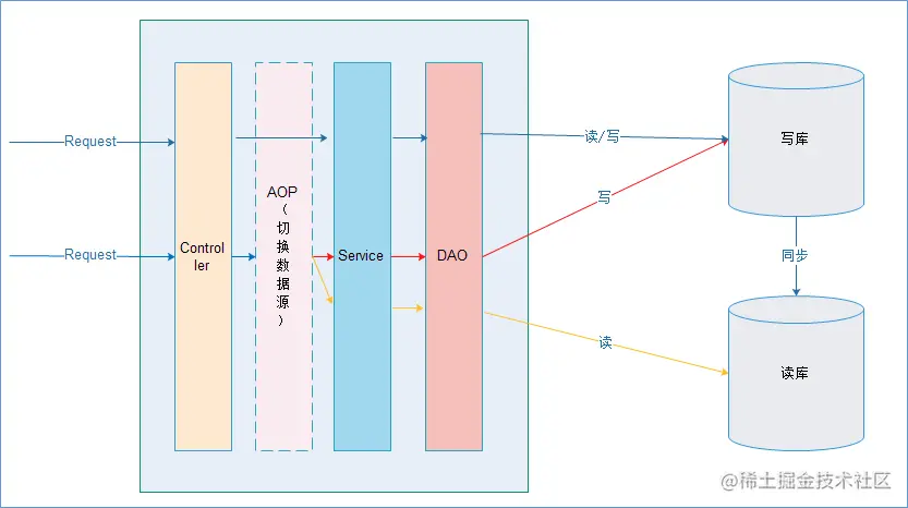 在进入Service之前,使用AOP来做出判断,是使用写库还是读库,判断依据可以根据方法名判断,比如说以query、find、get等开头的就走读库,其他的走写库。