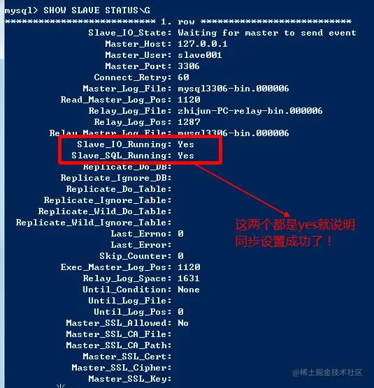 接下来,从从库命令行执行如下SQL语句。