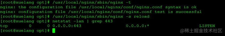 配置文件修改完毕后,用nginx -t 测试下配置无误,就reload一下nginx服务,检查443端口是否在监听: