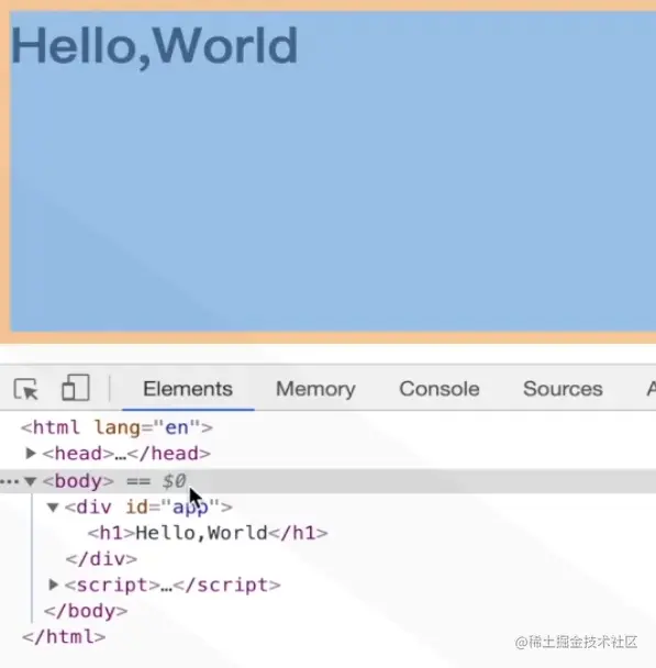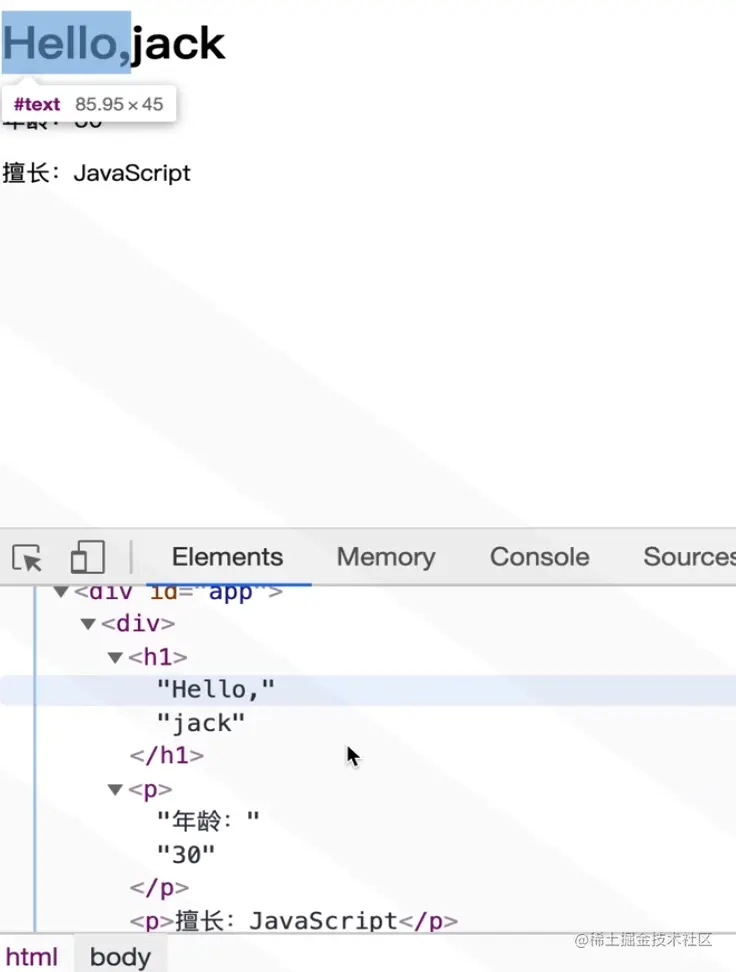 他只会更新我们这个对应的节点,前面这个节点它就不会发生变化,这个效率实际上是非常高的。让我们用过去的jQuery的话,会把整个html标签重新给他赋值渲染一遍。