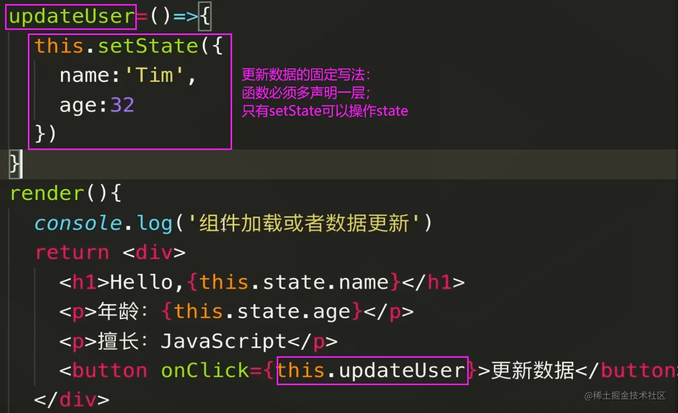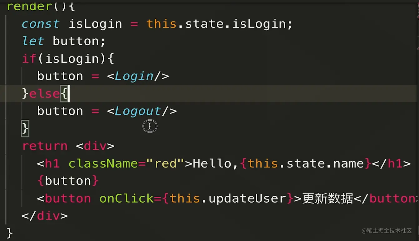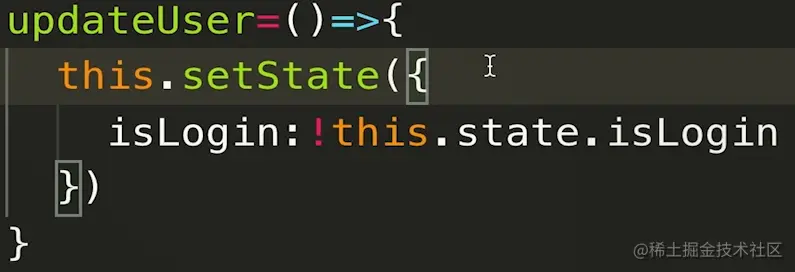 以上这个例子当中,我们可以通过点击更新数据的按钮触发updateUser事件。那么该事件会将state中的数据变为true。那么此时根据if else的控制语句,我们将显示login组件。