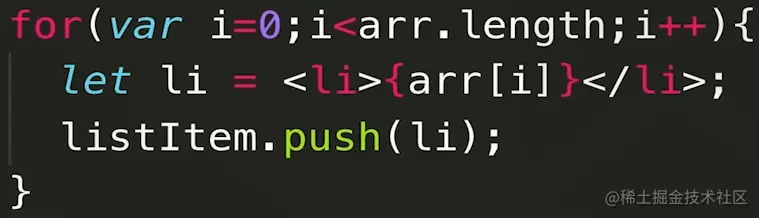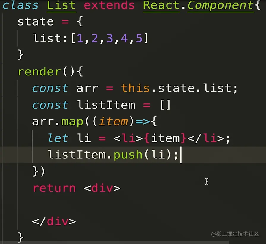 这部分的内容实际上就类似于vue当中的for循环渲染了。但在react我们并没有指令这么一说,我们只能通过原生数组的方法把数据渲染出来。