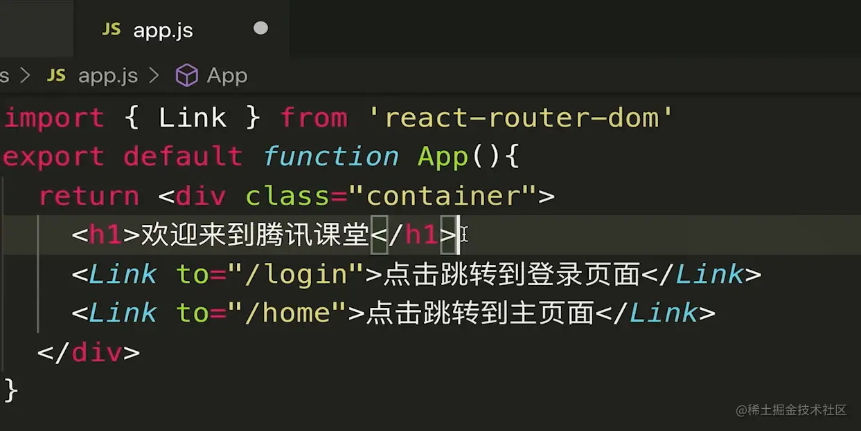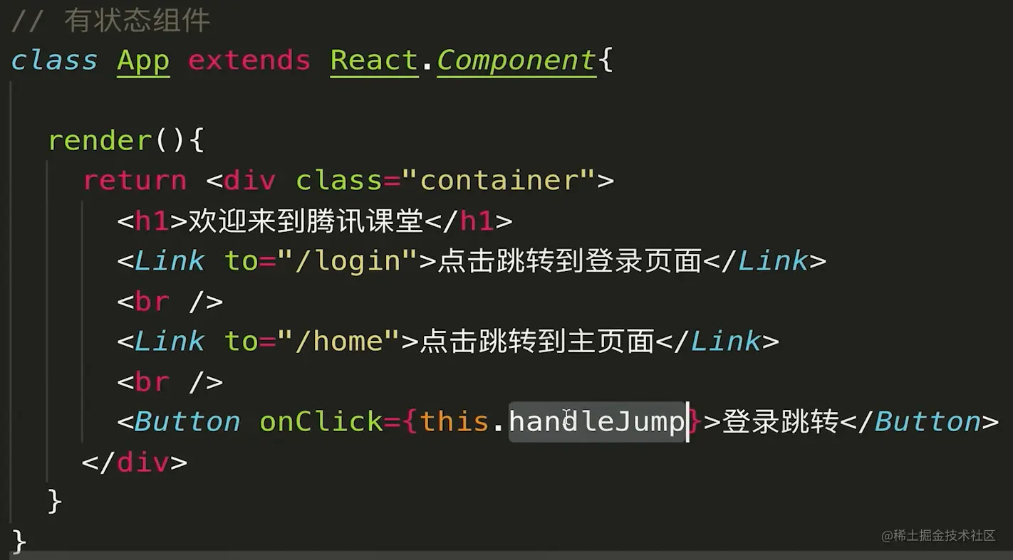 这里的Link和我们的a标签没有多大差异,都只是链接而已。以上是我们通过路由的方法进行跳转,如下我们创建class类组件演示JS跳转: