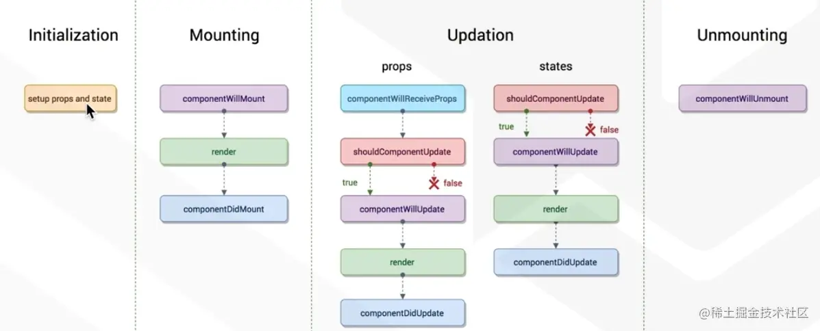 学习过vue生命周期的同学应该不会再有第一次对生命周期这个概念非常陌生的感觉了。那么react的生命周期也就是整个框架的执行过程。它的顺序是什么样子的,同时在不同的生命周期阶段会暴露出不同的构造函数,我们在构造函数里面就可以做很多不同的功能。我们分为四个阶段: