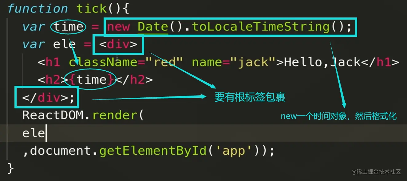 每次把同一个标签上去,实际上它没有任何的差异。但是当我们这个模型标签的内容发生变化了以后呢,react会来进行对比,把差异部分渲染上去,而不会重复的多次的进行插入和渲染,这就是为什么这类框架会比我们过去之前的一个框架效率要高的原因,那我们这同样给大家写个例子。官方文档中也是这个例子。 考虑一个计时器的例子: