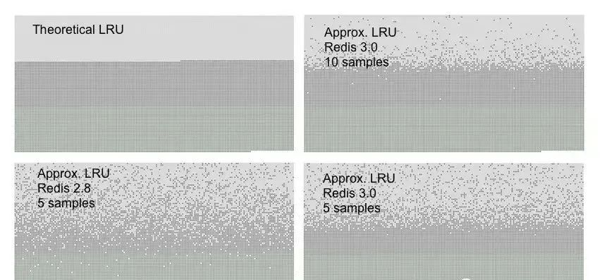 我们能看到Redis3.0采样数是10生成的图最接近于严格的LRU。而同样使用5个采样数,Redis3.0也要优于Redis2.8。