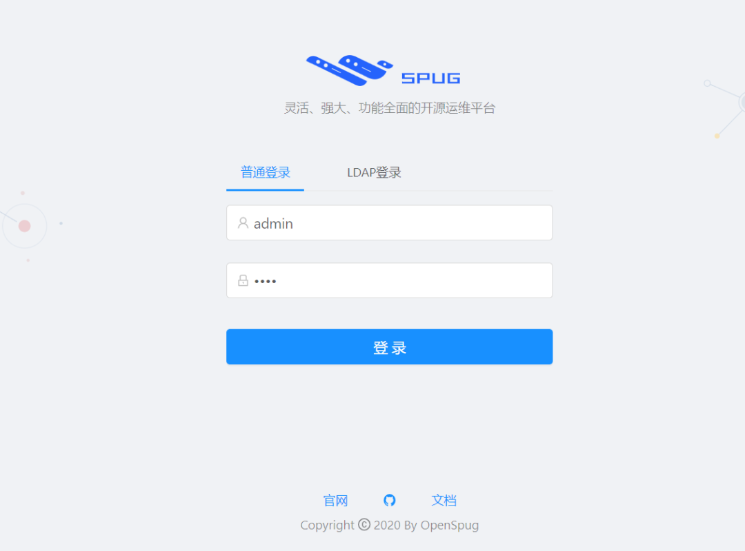 在浏览器中输入 http://localhost:80 访问,用户名:admin 密码:spug.dev