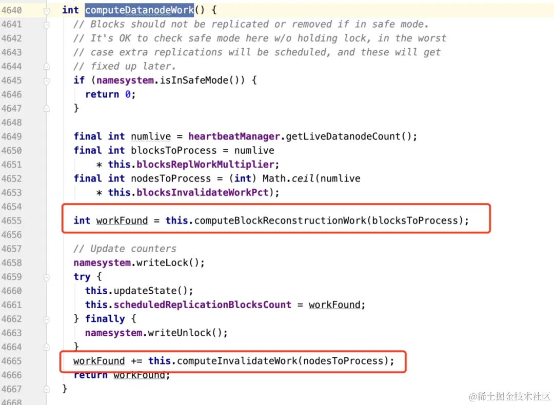 这个方法又会被computeDatanodeWork调用。这个方法的功能是:计算数据块复制和数据块删除的work,并且在下次heartbeat的时候通知到datanode。代码如下: