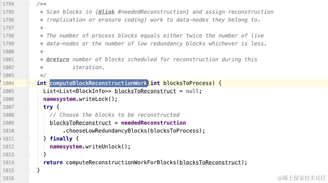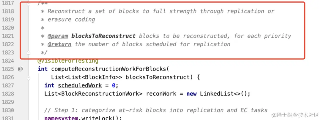 发现是computeReconstructionWorkForBlocks方法,这个方法注释写到:把一些数据块重现到full strength(满员)的状态,通过复制或者EC的方法。这个方法的参数是List类型,最外层的List代表优先级的意思,因为数据块复制任务也是有优先级的,比如当前就1个副本的块很可能会丢失,所以针对这种块的复制任务它的优先级就要比当前有2个副本的块的复制任务优先级高。这个也留个坑,后续系列会讲解复制任务的优先级。</list