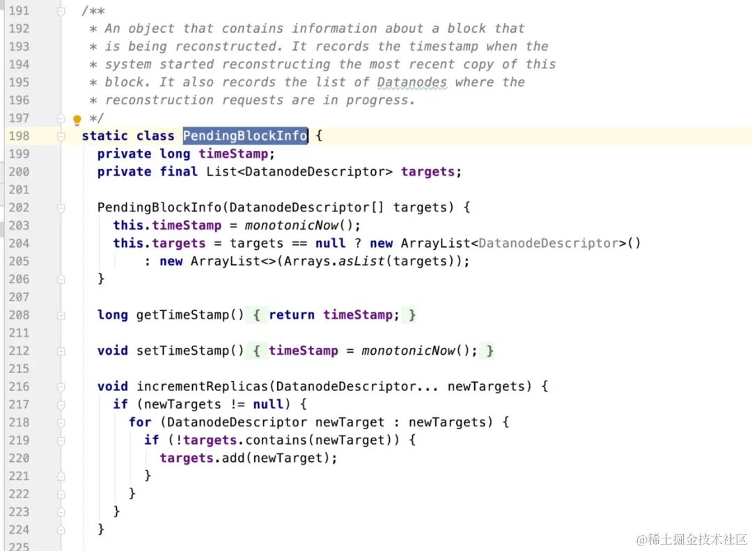 所以要搞懂这两个数据结构存储的内容是什么,就得去了解BlockInfo和PendingBlockInfo这两个类。这里简单概括:BlockInfo保存了一个block属于哪个文件INode(通过BlockCollection对象)和存储在那些Datanode里。PendingBlockInfo(数据块复制信息)是对数据块开始复制时间timeStamp、待复制的目标数据节点列表List实例targets的一个封装。