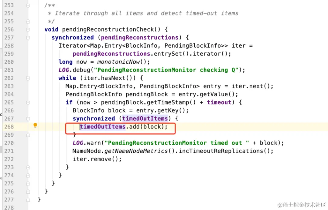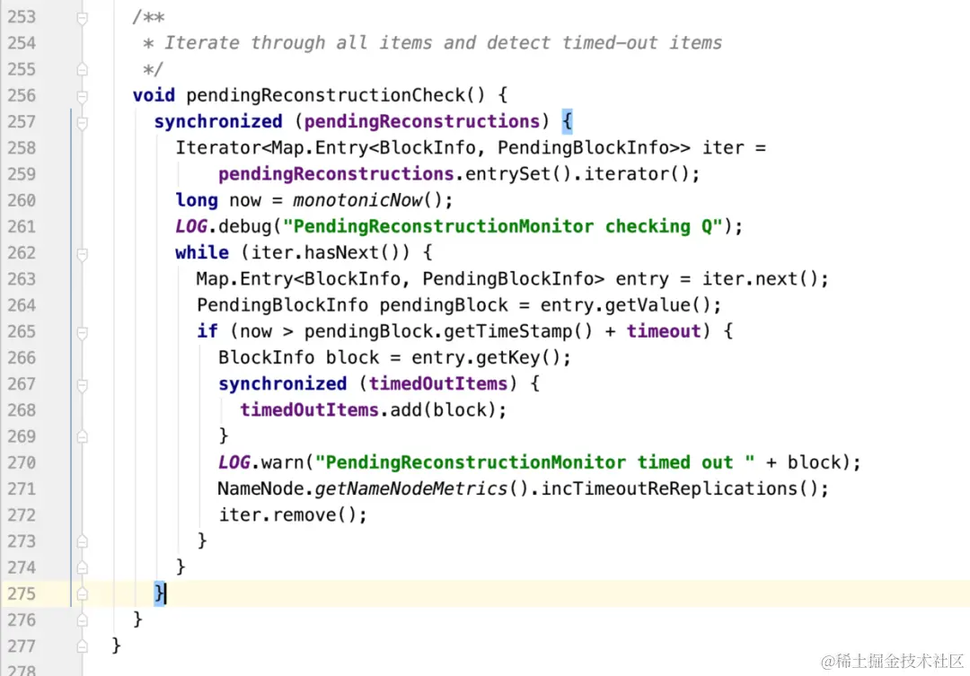 pendingReconstructionCheck方法的逻辑比较简单,就是去检测pendingReconstructions这个数据结构里保存的所有数据复制请求是不是超时(