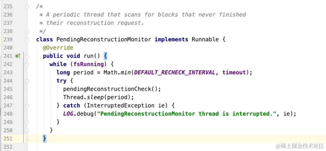PendingReconstructionMonitor是一个周期性的线程,用来扫描没完成重建数据块请求的数据块。