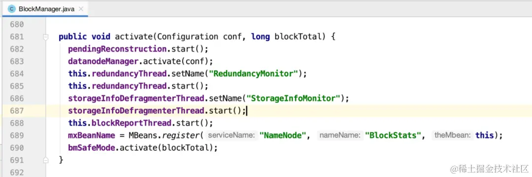 进到FSNamesystem的构造方法中。然后在FSNS类中找调用成员变量blockManager的地方。发现只有activate有激活启动的意思,于是去activate方法: