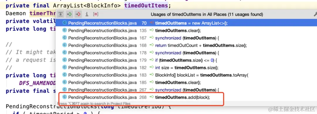 timedOutItems是一个ArrayList,里面存放BlockInfo类型的数据。
