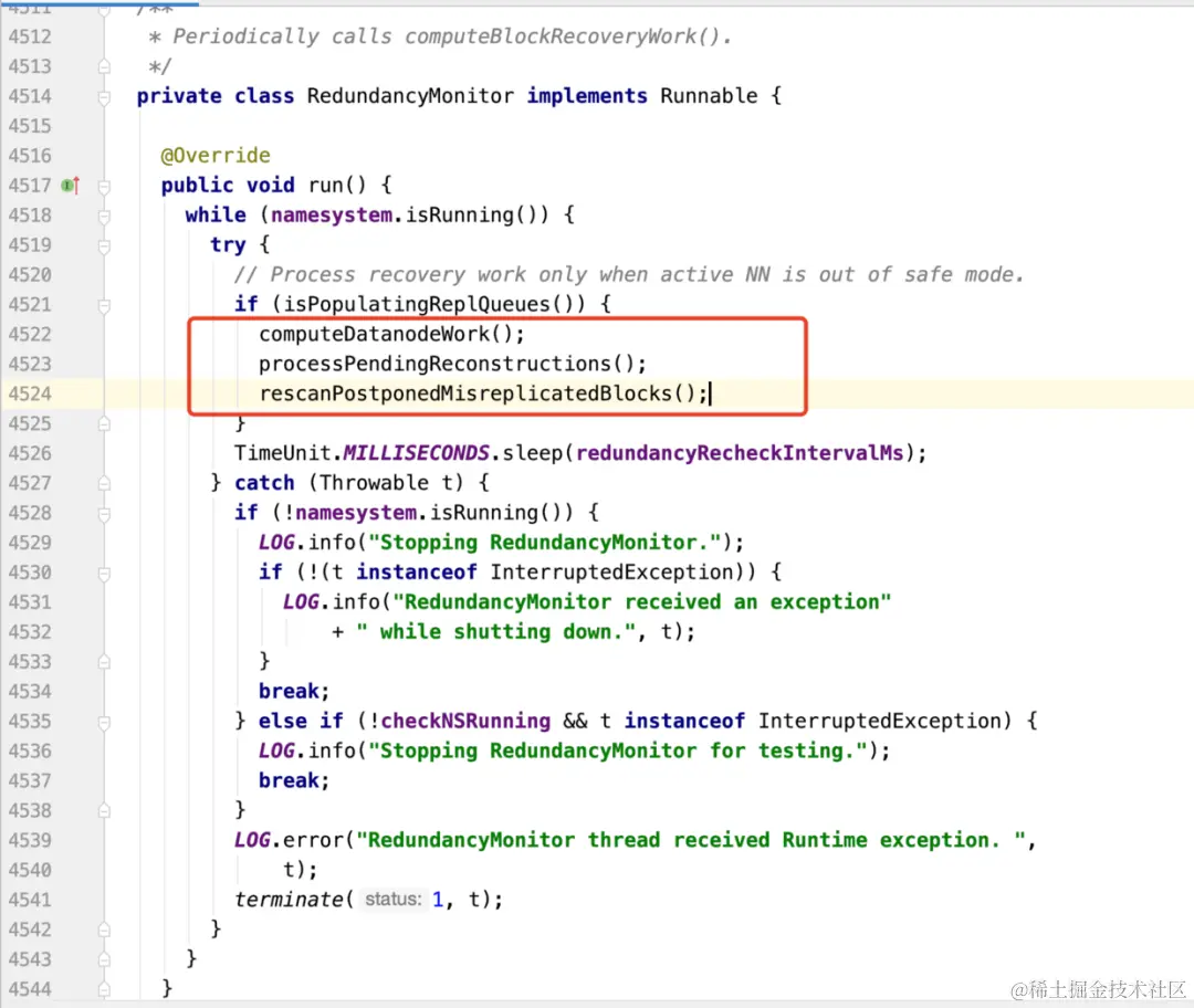 run方法的主要工作是:周期性的(redundancyRecheckIntervalMs)调用红框里的二个方法。生成数据块复制任务、处理数据块复制任务、重新扫描之前被推迟处理的数据块。