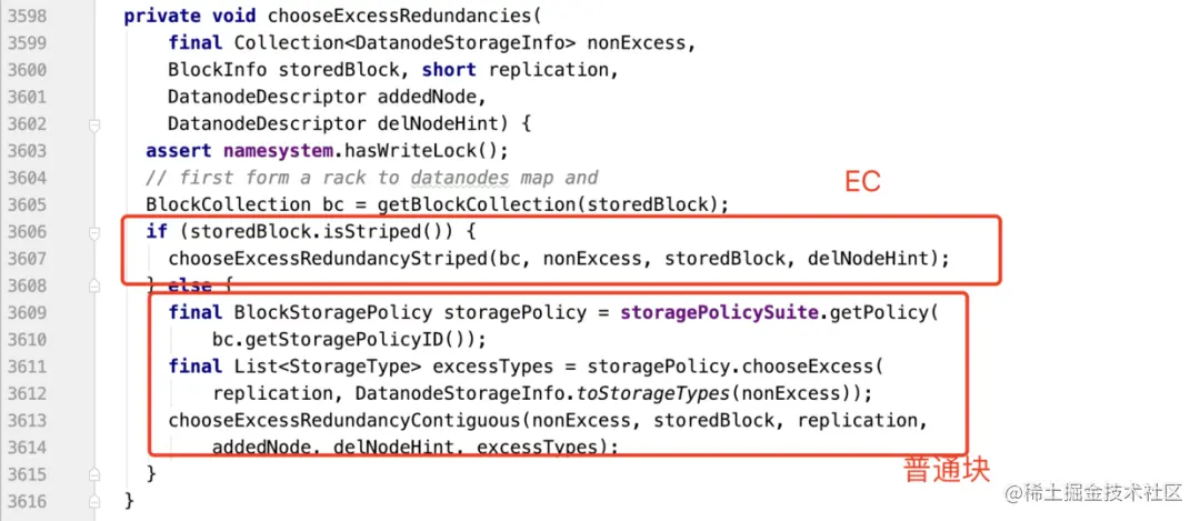 看下chooseExcessRedundancyContiguous方法,其实删除副本的策略和他这个注释我没看懂,功力目前太差。留个坑,以后看。