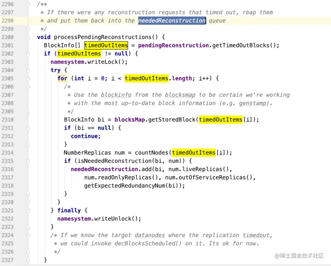 方法注释写道:如果有重建请求超时了,那就把他们重新放到neededReconstruction队列里。可见上一篇文章中的timedOutItems中的块,会被RedundancyMonitor线程处理。方法的逻辑也是比较简单易懂:遍历timeedOutItems,从blocksMap里找到对应的数据块信息,然后判断是否需要重建,如果需要就把重建相关信息添加到neededReconstruction里。