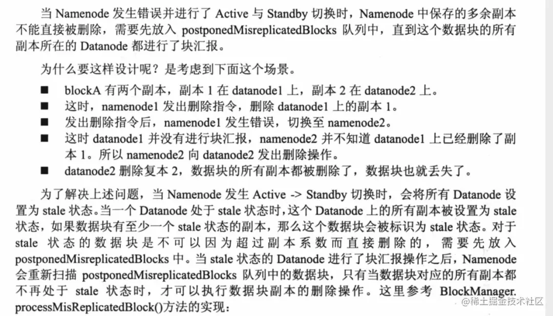 下面看第二个方法。方法名是rescanPostponedMisreplicatedBlocks,意为重新扫描之前推迟处理的副本数不正确的块。此方法里大量使用了postponedMisreplicatedBlocks这个队列,这个队列的作用是这样的:当Namenode 进行failover的时候,多余的块(over-replicated)是不能被处理的,直到这个数据块的所有副本所在的Datanode都向新的Active节点进行了块汇报。这么做的原因是防止发生数据块丢失。引自《Hadoop2.x HDFS源码深度剖析》的图: