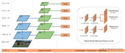 Center-ness取值为:0 < Center-ness < 1,训练损失为交叉熵损失。测试时,将Center-ness分支的权重值与相应的分类置信度相乘,用这个乘积得分对检测边框进行分值从大到小的排序,Center-ness结构使那些远离目标框中心的预测框得分也相应降低,提升检测的效果,偏移量损失是交叉熵损失,偏移量的目标值由预测框中心点至目标框坐标的距离决定 -
