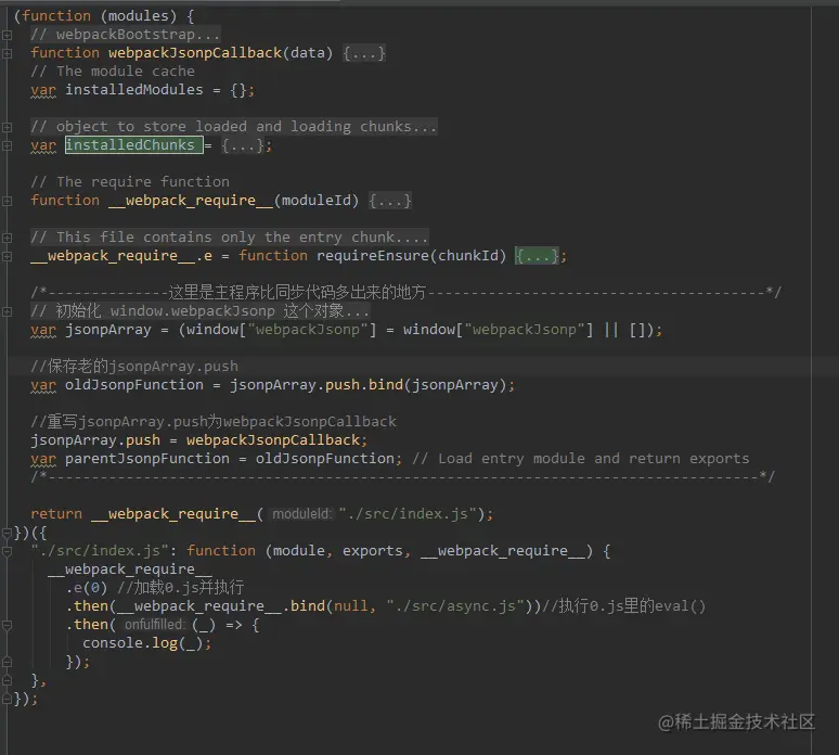 这段代码中,webpack为每一个异步模块都分配了一个 id,并维护了一个全局对象 installedChunks 用于存放 异步加载模块的信息,该例中如下:
