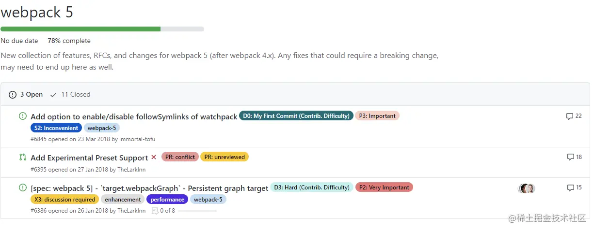 上图截自github,截止目前2020.8.20日,Webpack5的开发进度到78%
