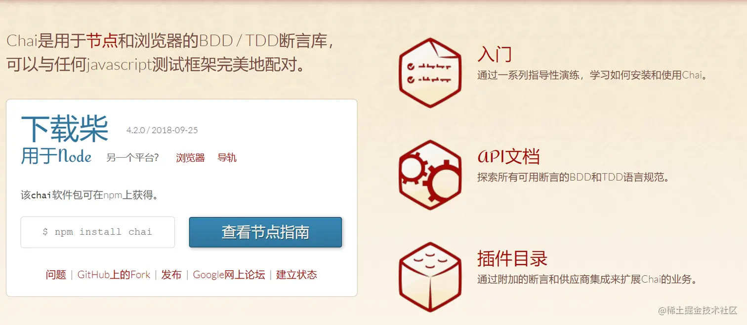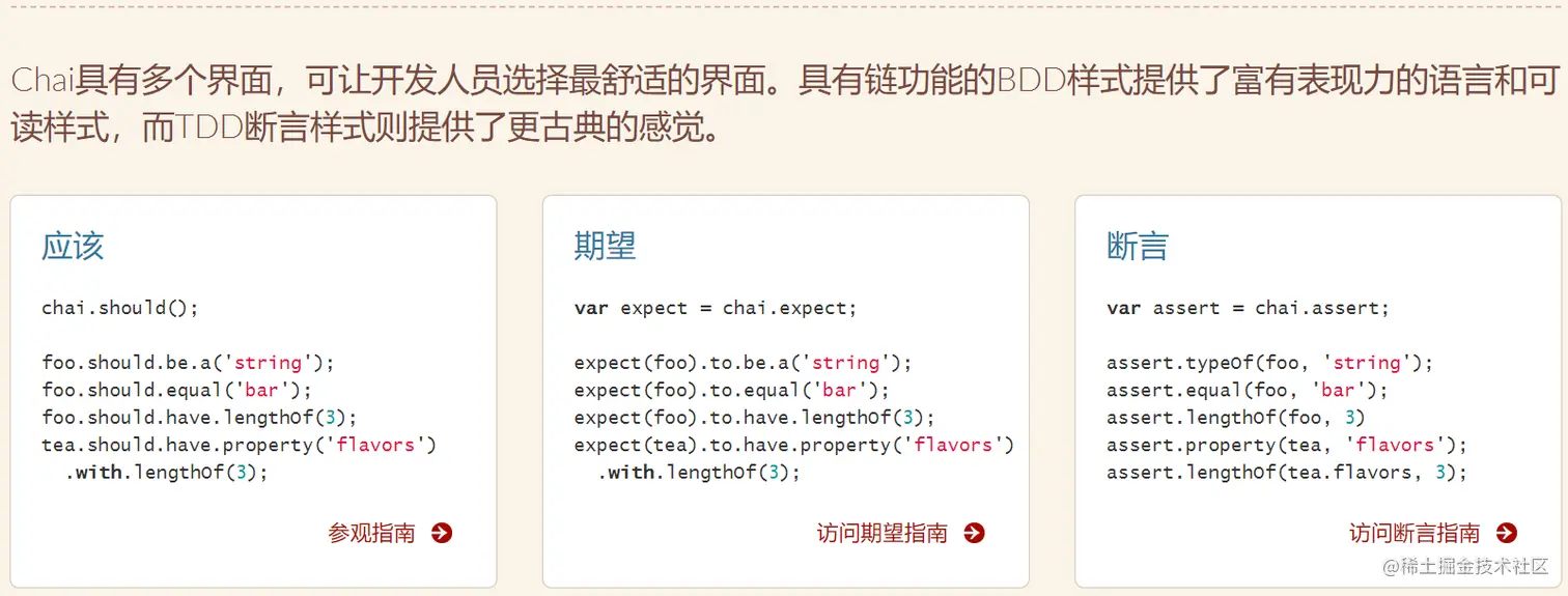Chai是用于节点和浏览器的BDD / TDD断言库,可以与任何javascript测试框架完美地配对。