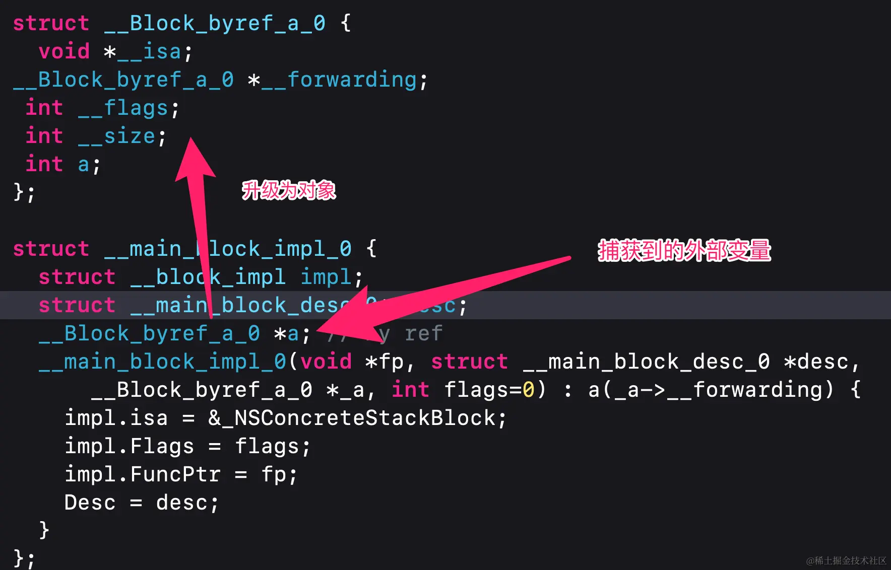 当一个基本类型的变量被block捕获之后, 它就不再是之前单纯的a了, a变得复杂了, 它变成了一个对象类型