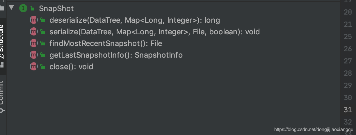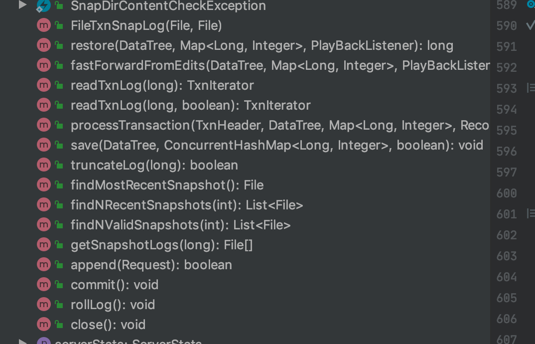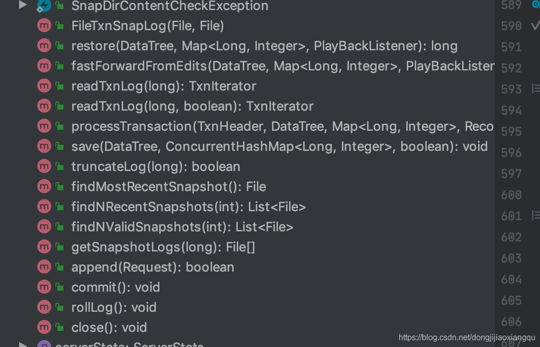 至此,我们的FileSnapLog基本就算讲完,主要的功能讲完,我们看下FileTxnSnapLog 这个东西的实现,这个功能其实就是结合前面的 TxnLog 和SnapLog的封装类,就是snapshot 日志和 txnLog 日志持久化相关操作的