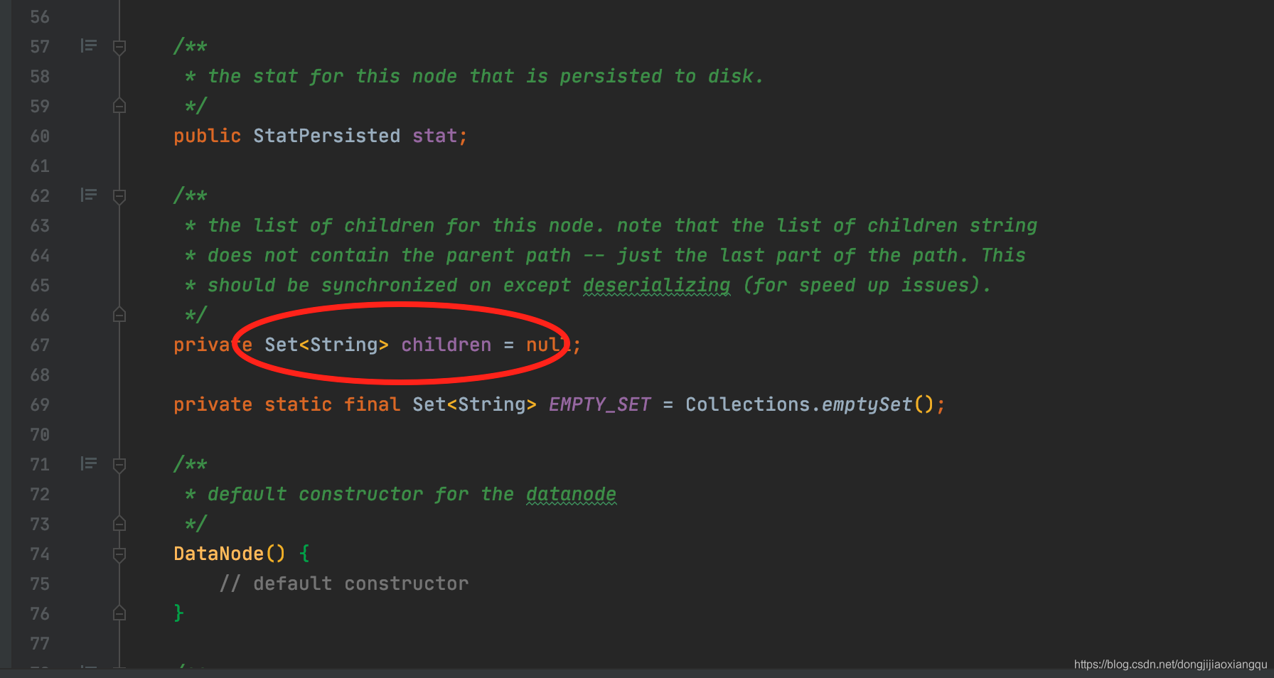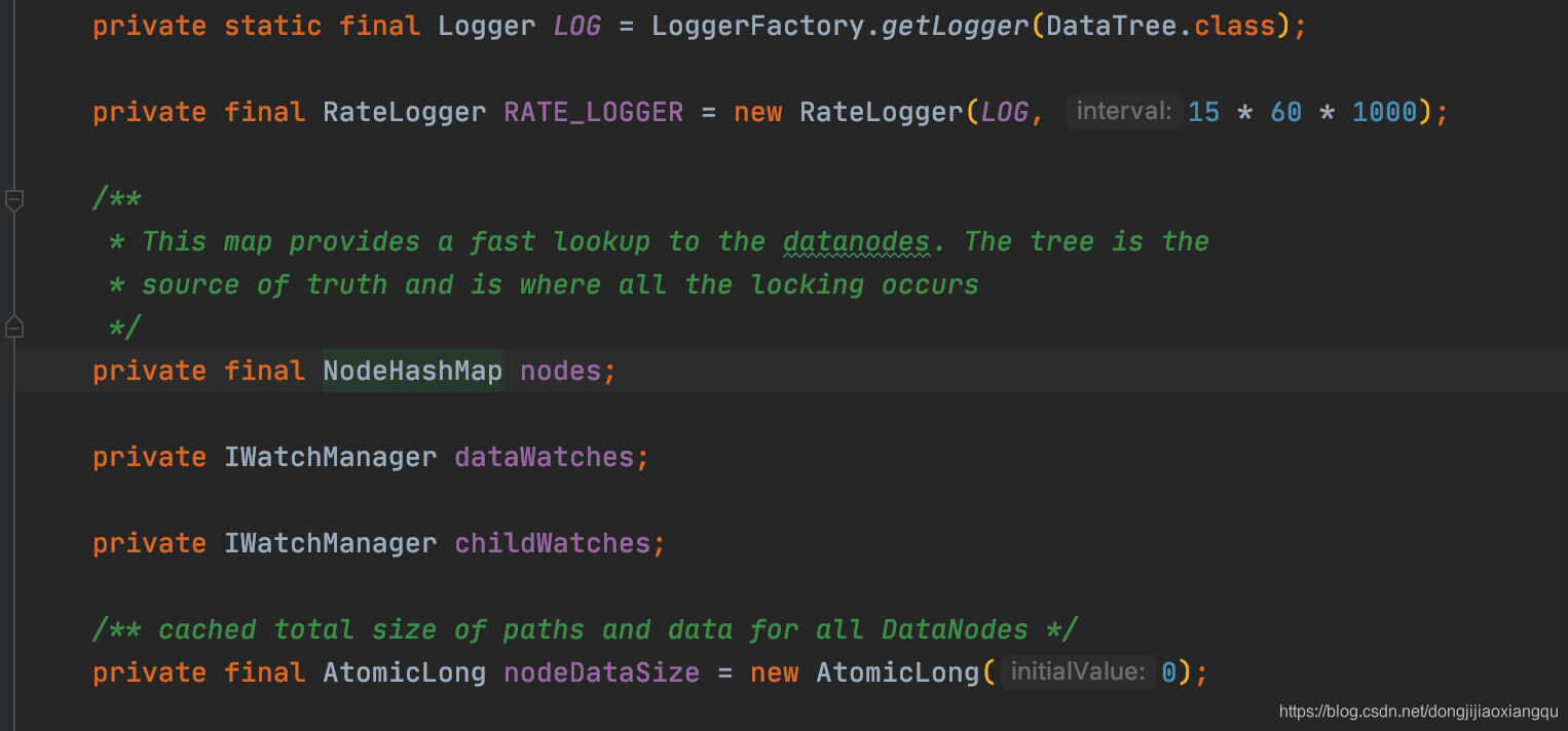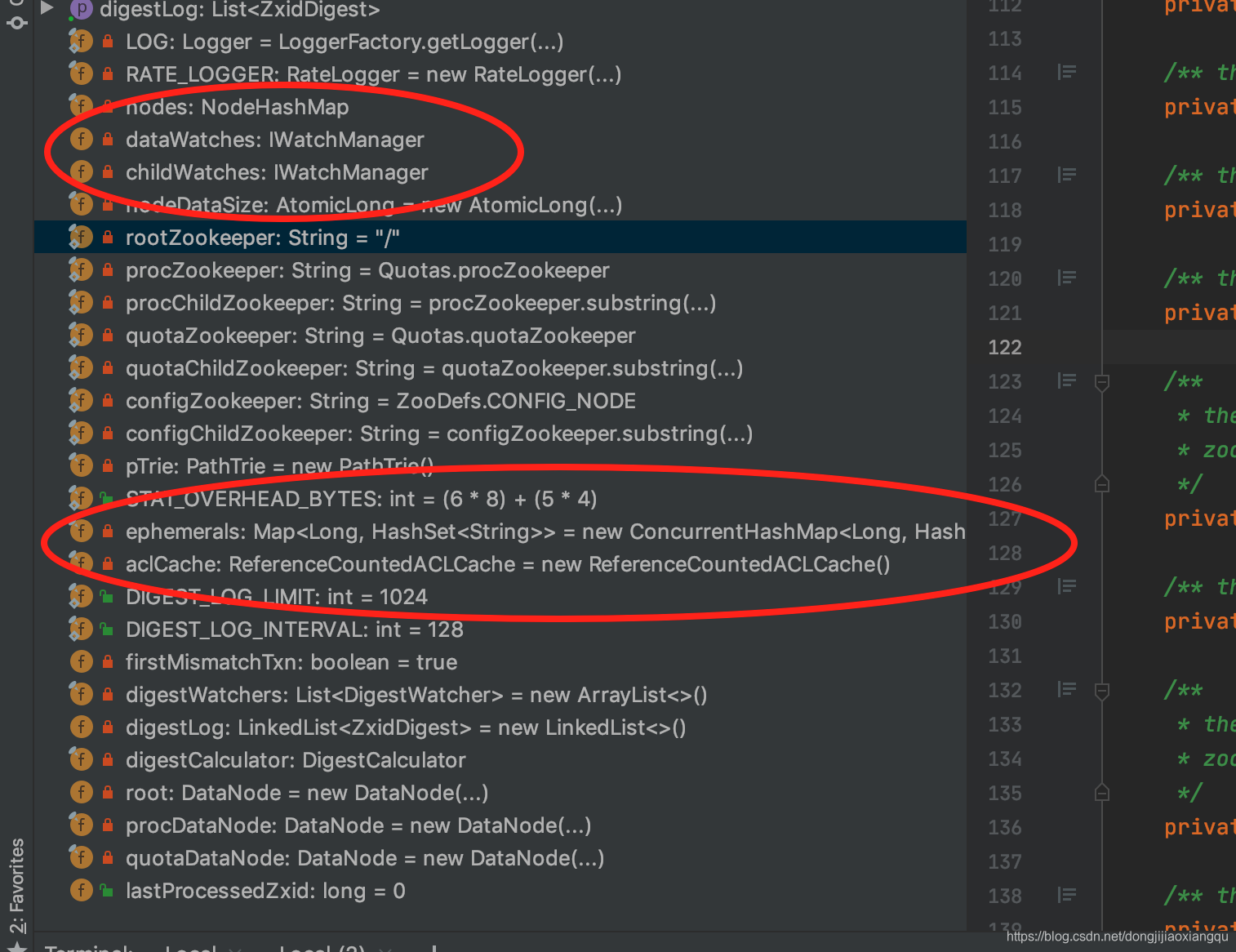 这里需要注意的是dataWatches, childWatches ,这两个看名字可以看出一个是数据变动时候通知观察者,另一个是子节点变动时候通知观察者的,观察列表。还有就是ephemerals 临时节点列表,其他的一些数据变量包括一些 zk的 config 节点和quotas 节点的一些元数据信息。
