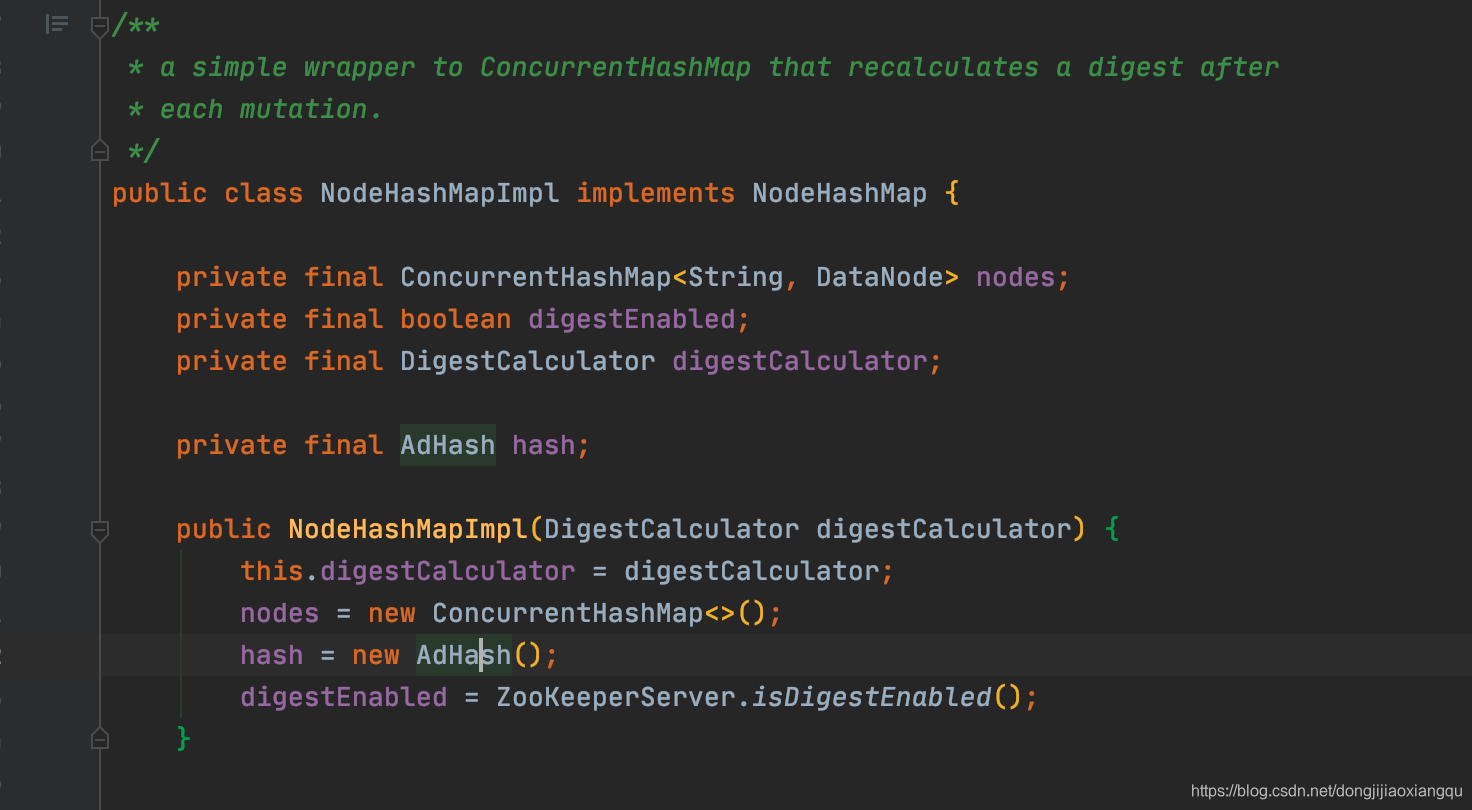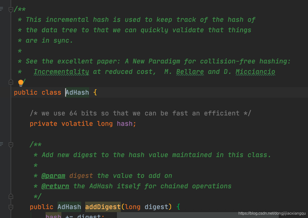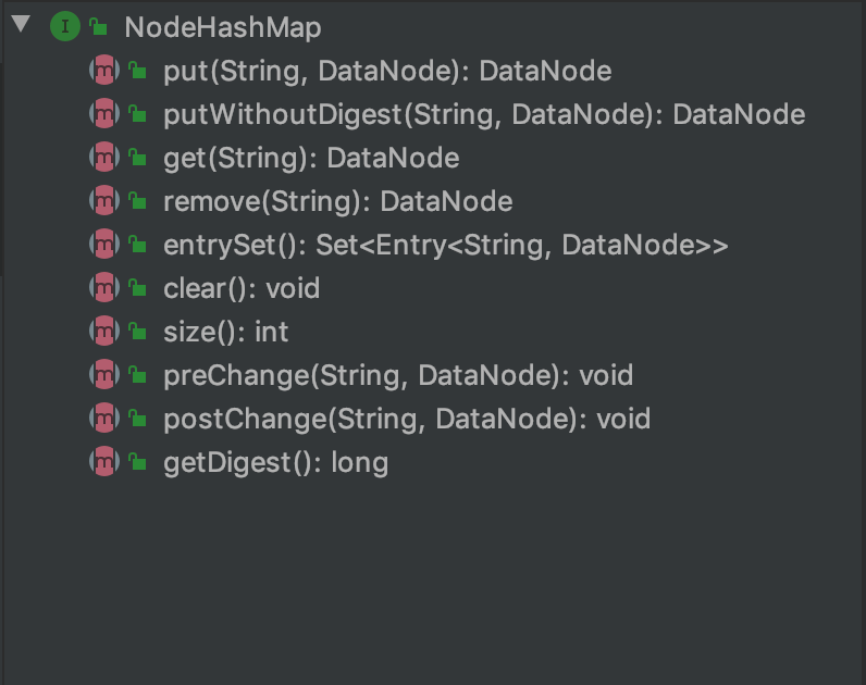 可以文件头注释,可以看到这个digest的解释是,保存整体NodeHashMap的每个节点的hash值并进行累加或者删减的操作,通过这种方式能够track 整体HashMap里面的值有没有数据变更,里面还特意提到sync的时候,估计是 从节点需要同步主节点数据时候,不能让主节点的数据被篡改的一种摘要校验。这种保证全局数据有没有被改动而进行的hash 累加的方式,也是值得学习的。这让我想起了,有些组件的其他判断数据有无变更的方式,是通过version累加的方式来进行的,通过cas判断来查看是否有数据变更。