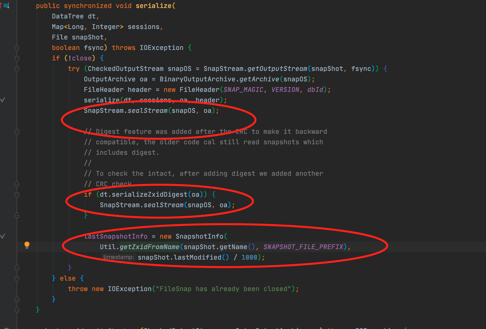 SerializeUtils.serializeSnapshot(dt, oa, sessions);