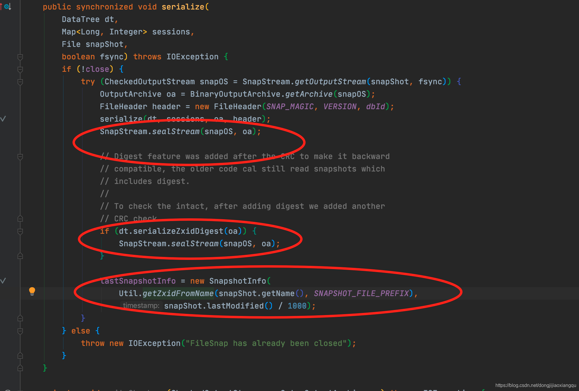 这个没啥好说,先把header 序列化完以后,再序列化snapshots, 直接看SerializeUtils 里面的实现