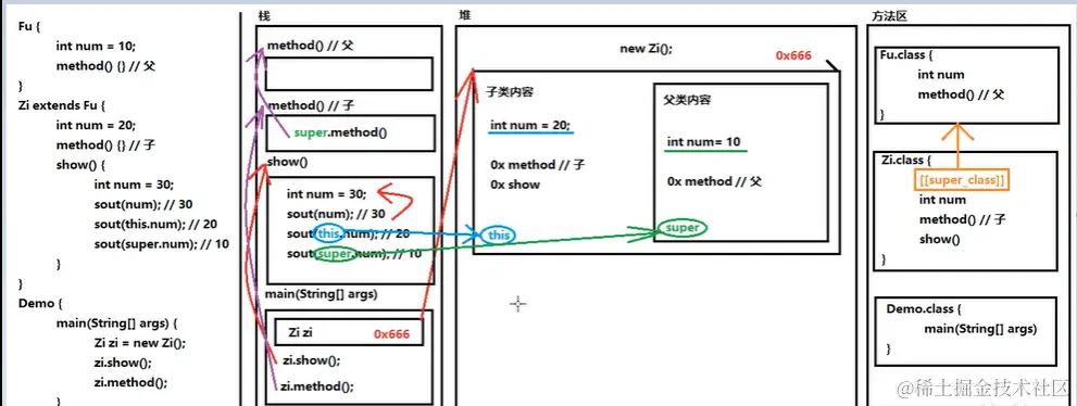 java面向对象super 和 this的内存关系 SwayZhang 2020-08-22 118 阅读1分钟 又到了大家最爱的贴图环节 今天给大家准备了java面向对象super 和 this的内存关系图,说难不难关键在理解。 很重要的一点就是要理解清除super和this的空间划分关系