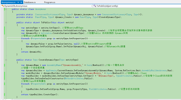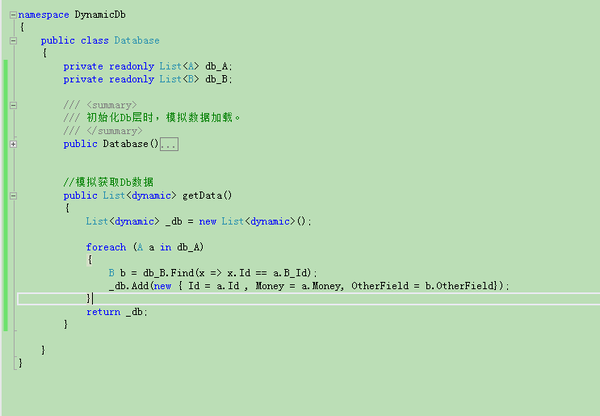 这种写法节省了内存,也很便利,但是在真实的项目中,不实用!因为很多项目都是MVC模式开发,会有一个数据层,控制层,View层,上面“例1”中的写法,大多数是在数据层去添加并返回的,db_1里面全是匿名对象,如何在控制层去使用匿名对象?大家肯定会说不是还有struct构造函数吗?确实,struct确实可以解决这类问题,但是个人觉得使用struct来完成这项工作实在是太累了,比如说:一个项目有100多种视图呢?难道要声明100多种struct构造函数吗?所以dynamic的实用技巧体现出来了!参考下图: