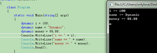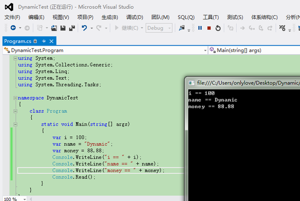 根据上面两张图片,大家肯定很清楚的知道var与dynamic的具体区别与用途了,那么,我们的程序运行起来,会有什么效果呢?