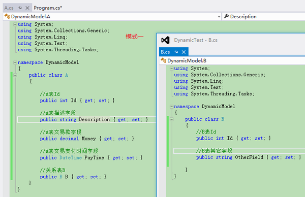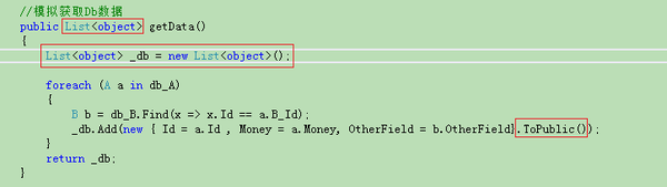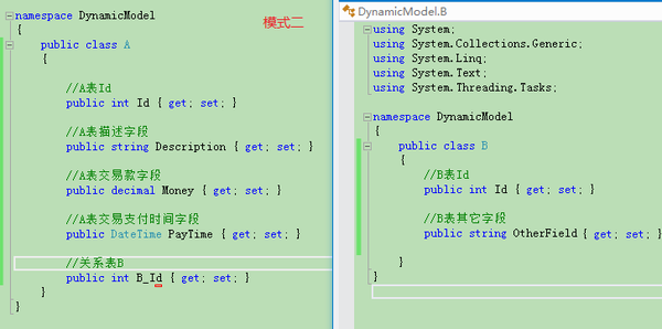 在这两种模式中,使用模式一的程序员还好,使用模式二中的程序员肯定很苦,然而,UI中在显示数据时,并不是所有的字段都需要,给服务器内存造成很大的浪费,大家马上会想到匿名对象和var的使用(假如我们这里只要A表的Id、Money,B表的OtherField):