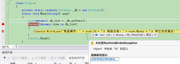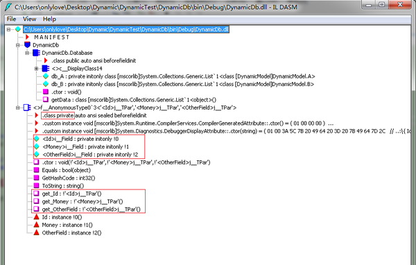 运行之后,会显示RuntimeBinderException错误,提示object未包含Id的定义,而我们明显看到view下面是有Id字段的,并且有值,这是为什么呢?其实这是匿名对象引起的,当我们创建一个类的时候,会声明Class是否public、Internal,但是匿名类型我们无法去声明对象是什么访问级别,我们现在用MSIL看下我们的匿名类型,如下图: