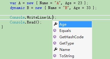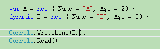 接下来,我们在深入的看下dynamic的作用,dynamic肯定不是微软大神们给程序员们设计出来的玩具,肯定还有其它用途,大家肯定想到了,匿名对象!具体var和dynamic在匿名对象上使用有什么区别呢?如下图: