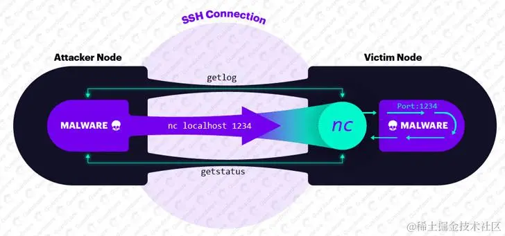 在受感染机器上运行本地netcat客户端,通过标准SSH端口建立其P2P命令隧道。通过SSH发送的任何命令都将用作netcat的输入并传输给恶意软件。