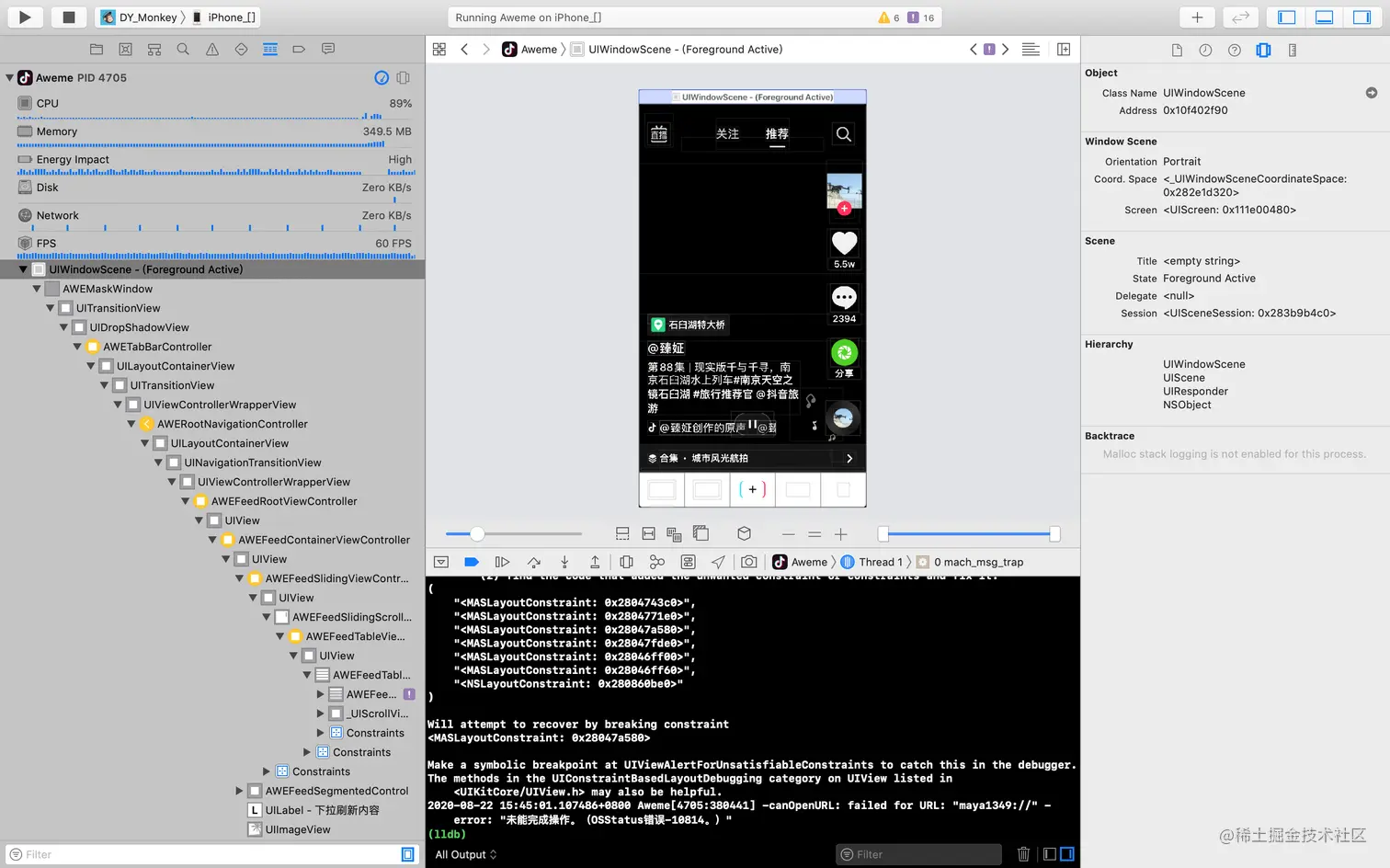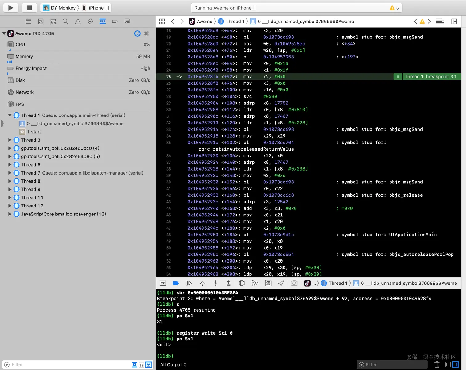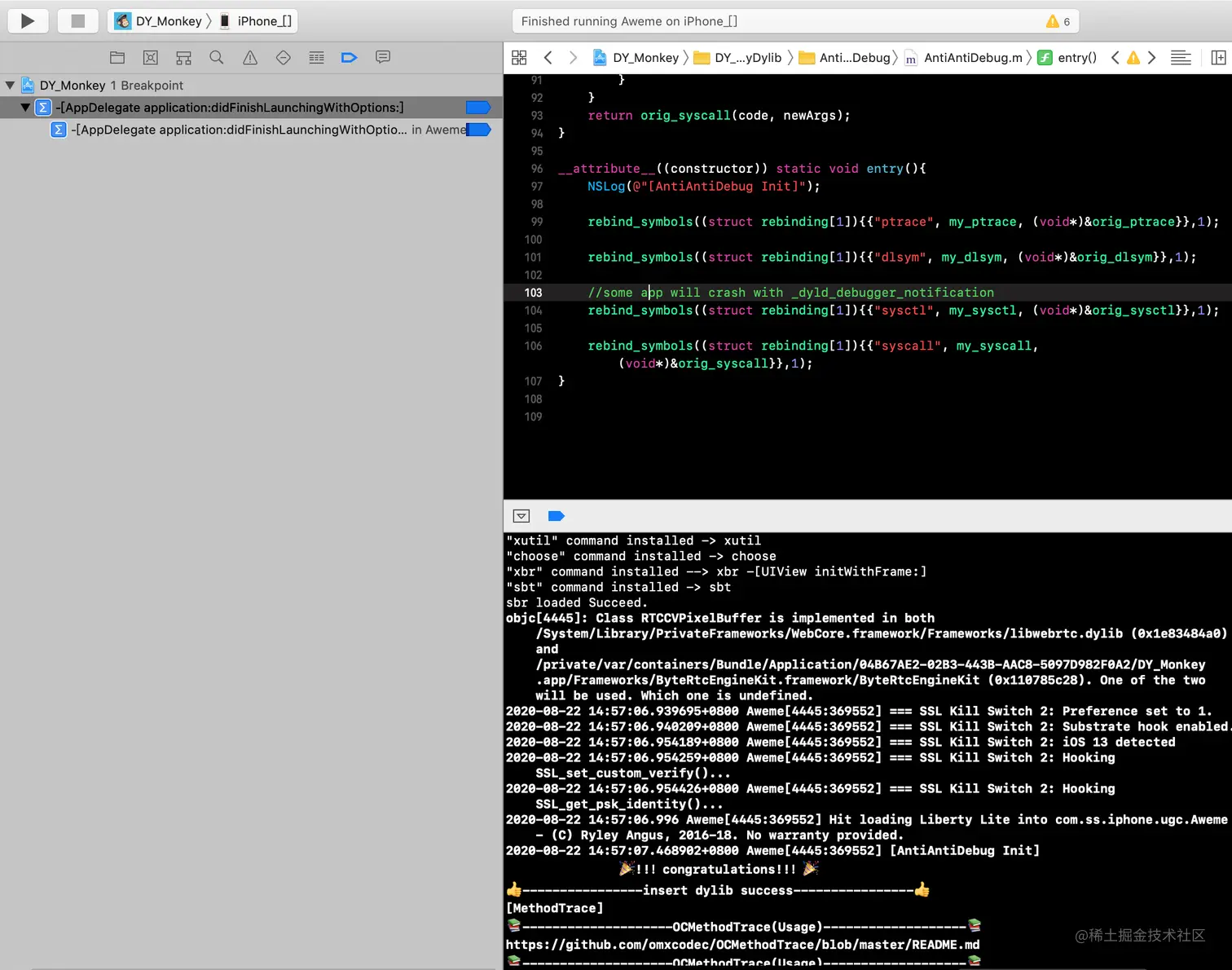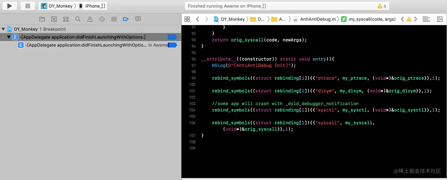 ** 菜鸟一枚,周末闲来无事,想着对某音进行逆向分析研究练练手;当我兴致冲冲的用MonkeyDev启动应用程序后,调试器与应用程序断开了,导致调试工作无法进行。 **