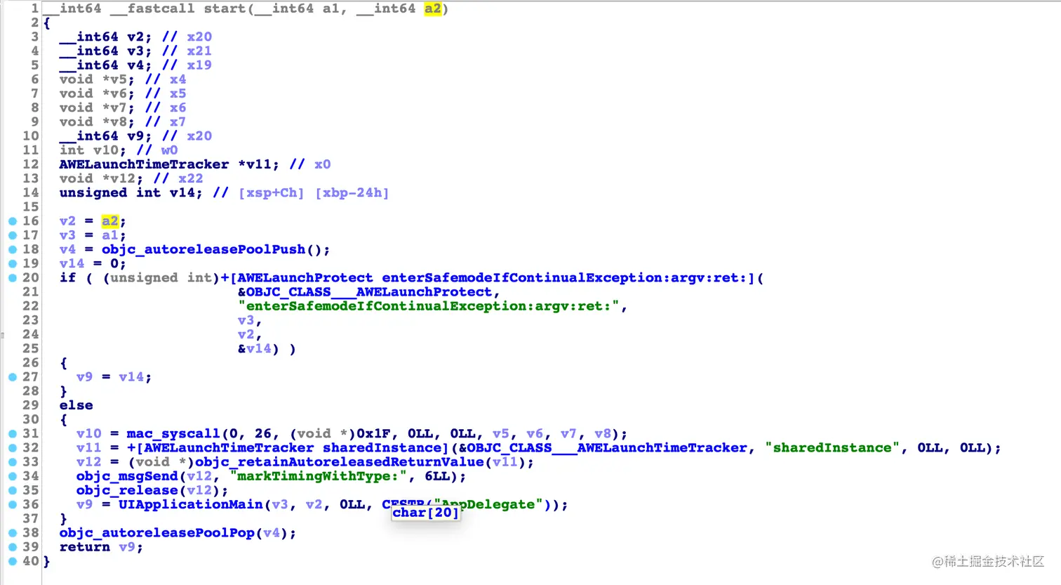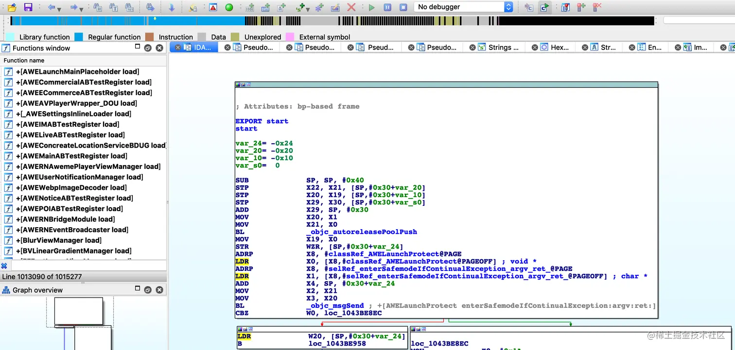 ** 上图中伪码和汇编已经很明显的告诉我们了,从汇编的00000001043BE8EC位置到00000001043BE900,它就是反调试逻辑。 1A转换成十进制就是26,1F转换成就是31,26就是函数编号,通过Apple提供的System Call Table 可以查出ptrace的编号为26,通过“SVC 0x80”指令发起系统调用。 所以某音是通过调用ptrace函数可以阻止调试器依附:ptrace(31, 0, 0, 0) **