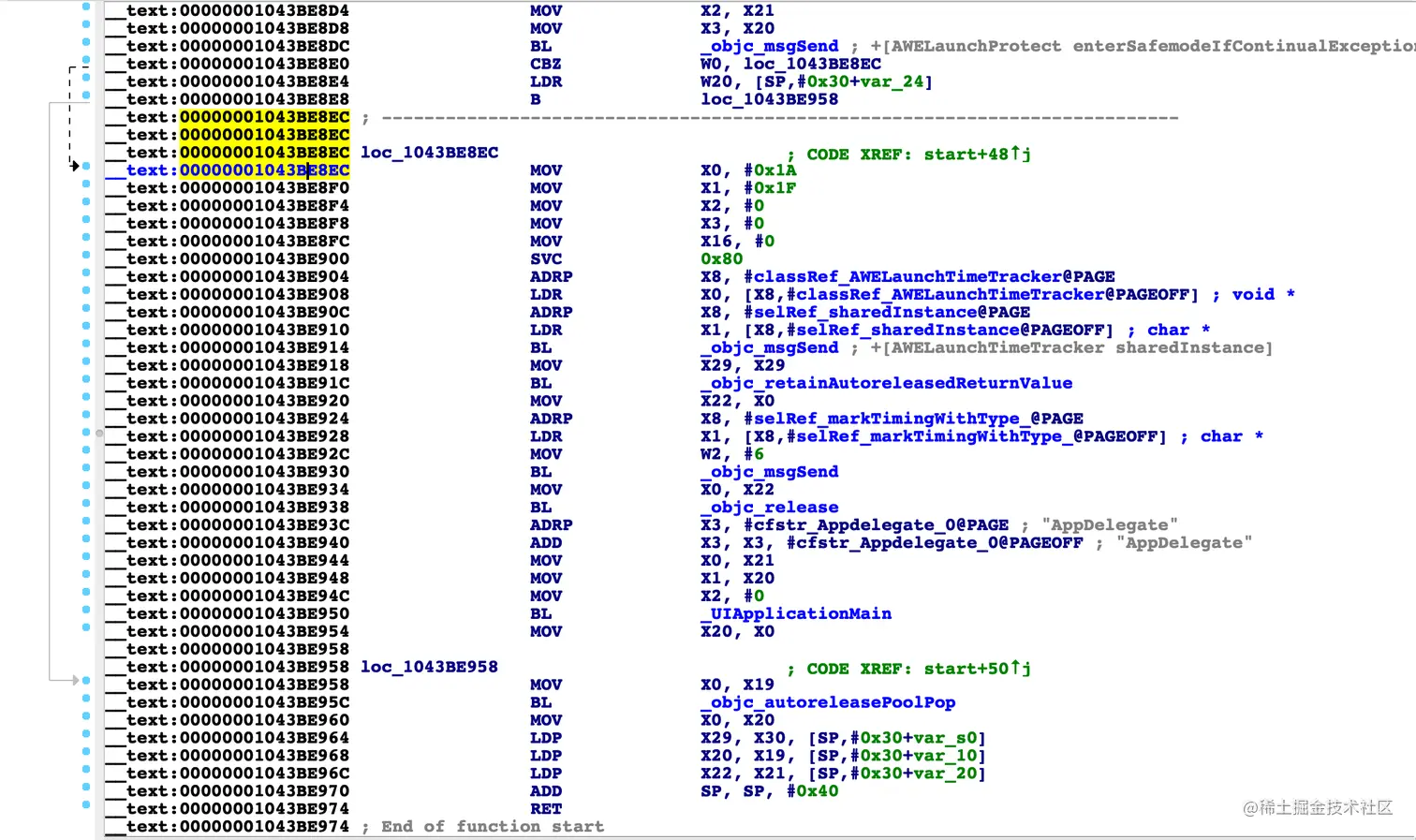 接下来就可以验证咱的找到的逻辑是否真的可以绕过反调试:给00000001043BE8F4下断点,等断点断住之后,修改寄存器x1的值,把它从31改成0。