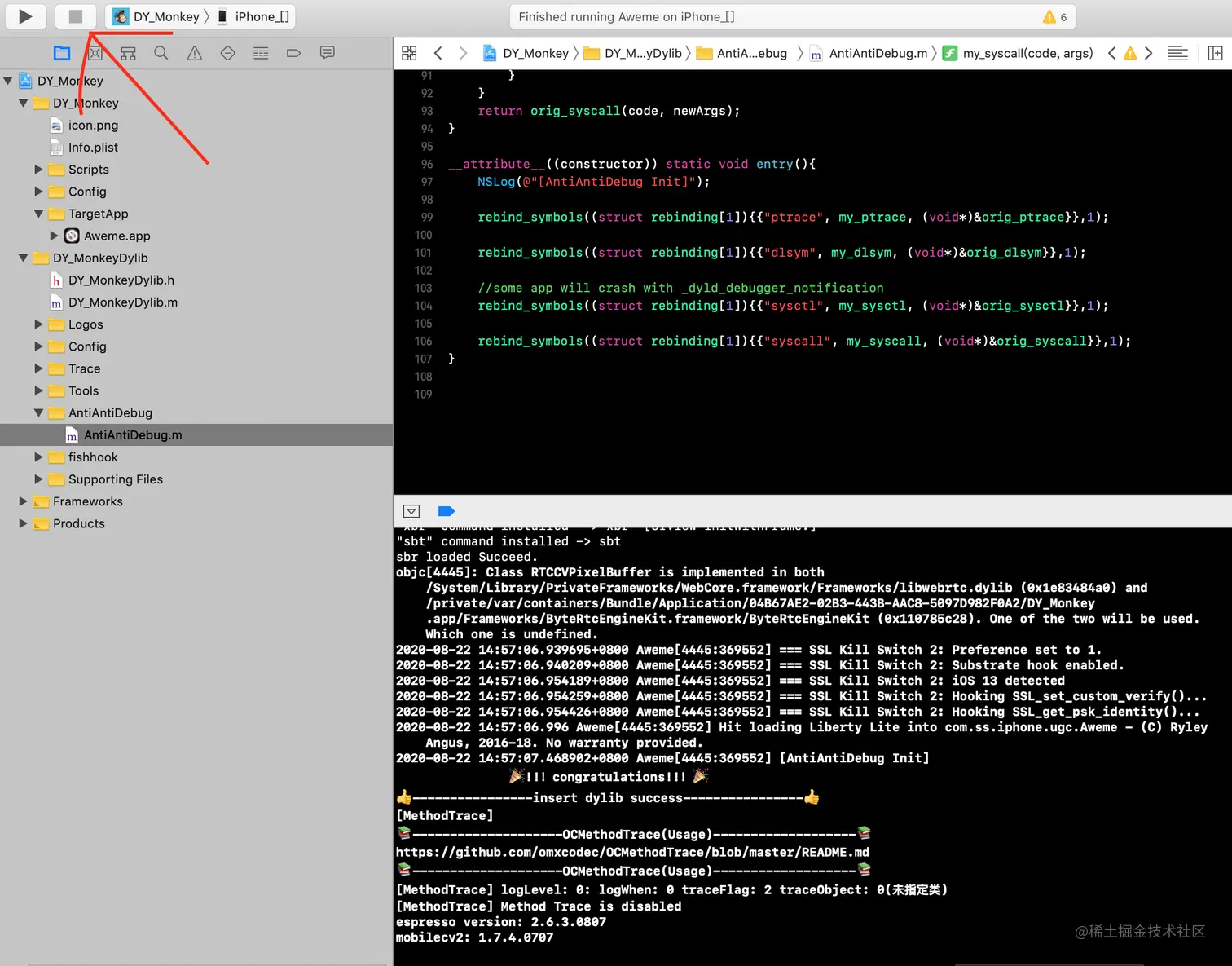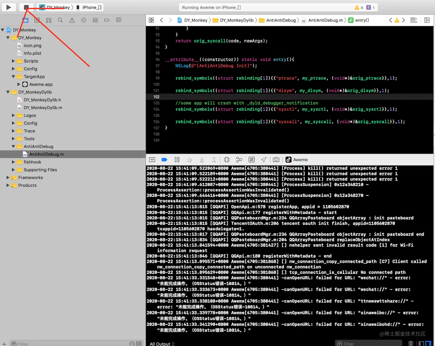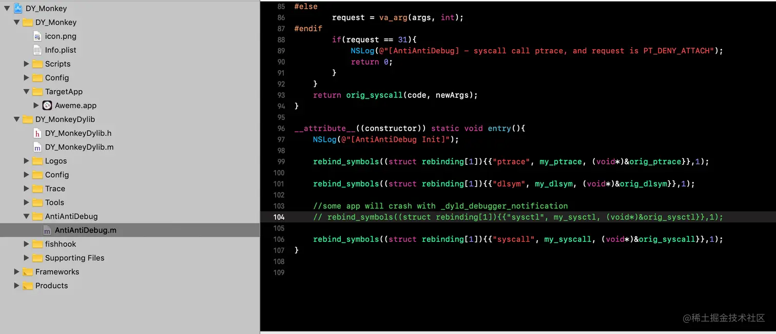 首先将MonkeyDev中AntiAntiDebug.m中“sysctl”注释打开,继续运行工程